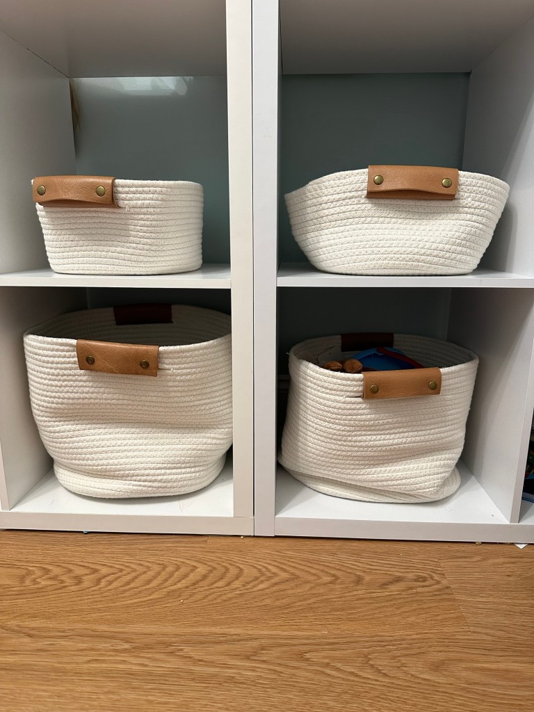 We use these cute storage baskets and cube storage system in our playroom. For us, it’s easy to just throw toys into baskets at the end of the day.